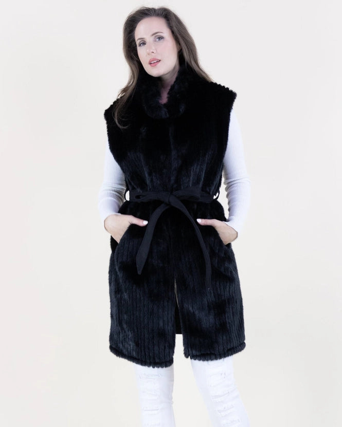 Vertical ribbed faux fur belted vest. Suede in the back and faux fur on the front. Fur collar
