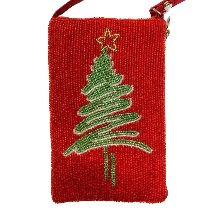Christmas Club Bag perfect for the Holiday Season. Hand beaded by artisans in India, this versatile smart phone bag can be worn cross body or as a wristlet. Includes 54" cross body strap that can tuck inside when not in use, a short strap that unsnaps so the bag can be attached to a larger bag or belt, and a separate, secure side zip pocket for cash and credit cards.