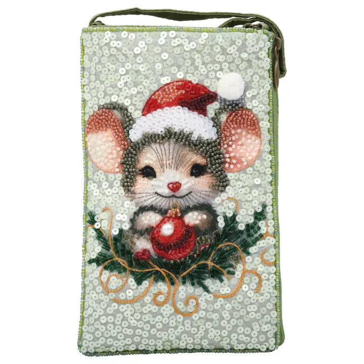 Christmas Club Bag perfect for the Holiday Season. Hand beaded by artisans in India, this versatile smart phone bag can be worn cross body or as a wristlet. Includes 54" cross body strap that can tuck inside when not in use, a short strap that unsnaps so the bag can be attached to a larger bag or belt, and a separate, secure side zip pocket for cash and credit cards.