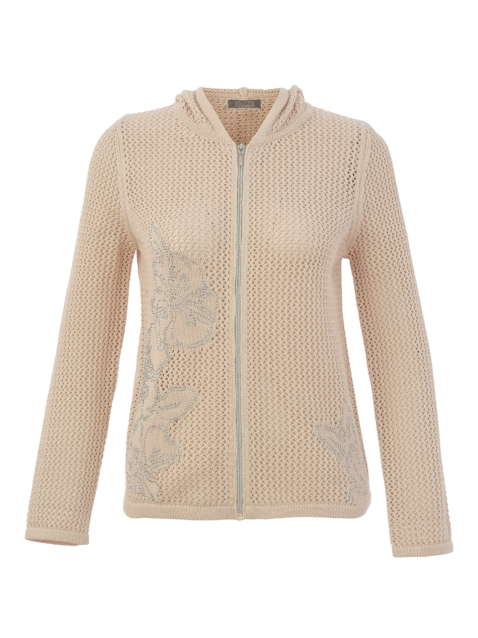 Dolcezza zip up jacket with hood. This jacket is stretchable and soft. It is embellished with crystals.