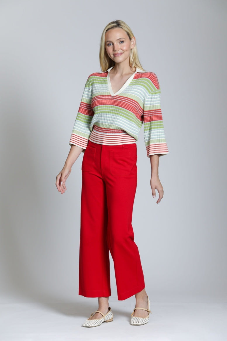 Ribbed striped v neck, 3/4 full sleeves.